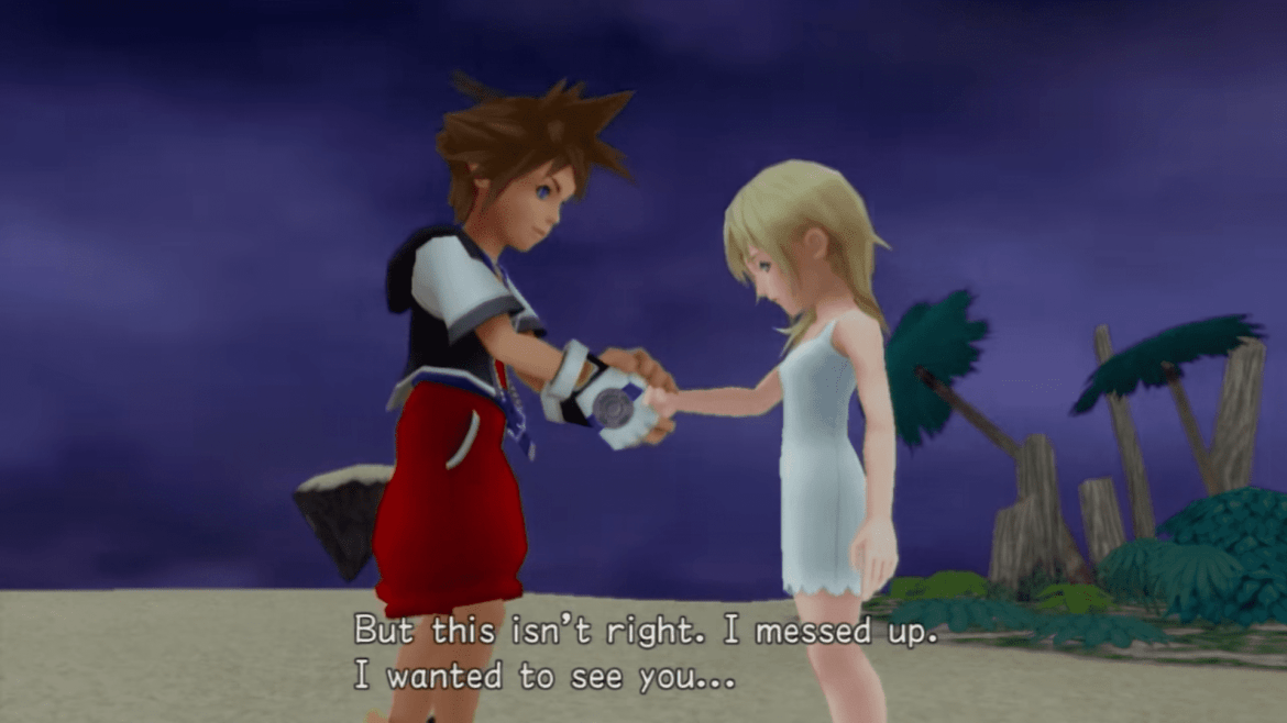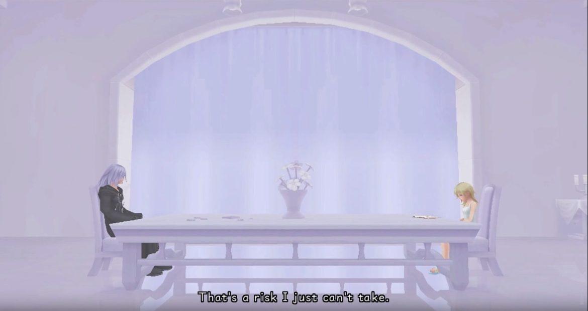Il giovane Custode decide di condividere con la ragazza quanto ha appreso da Naminé sul legame tra lei e Sora e, fondamentalmente, la mette al corrente del fatto che dovrà prendere una decisione: tenere i ricordi e continuare a vivere, oppure riconsegnarli a Sora e svanire per sempre. Riku decide di darle un po’ di tempo per pensare alla difficile scelta e, nel frattempo, si offre di starle accanto.